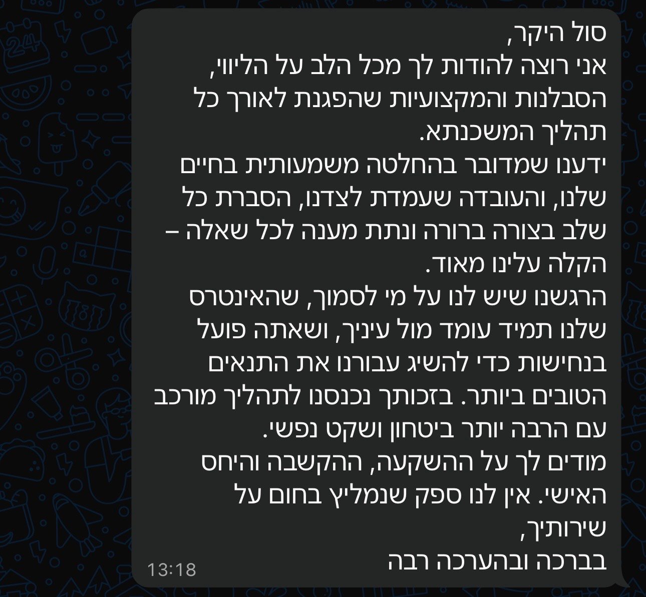 אחרי שנים של שירות פיקודי בצה״ל בתפקיד מ״פ, לקחתי את הערכים שהובילו אותי בשירות – אחריות, שקיפות ודוגמה אישית – והעברתי אותם לעולם הפיננסים והנדל״ן.