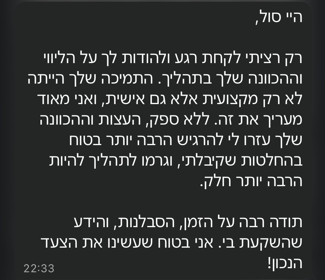 "בתיק עדין ורב־משמעות שניהלתי, המשרד ליווה אותי לאורך כל הדרך ברגישות ובמקצועיות. היכולת שלהם לזהות את הכיוונים בהם חושבת הפרקליטות ולבנות אסטרטגיה משפטית מושלמת, היא נדירה. מעבר לכך, קיבלתי מענה אנושי, אכפתי ומסור. אין לי ספק שבחרתי נכון."